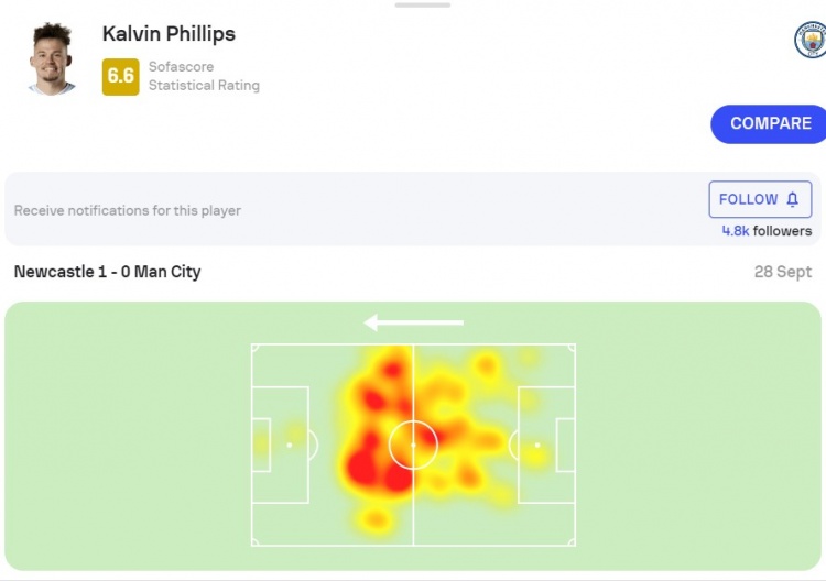 菲利普斯全场数据:14次对抗仅成功3次,获评全队最低6.6分