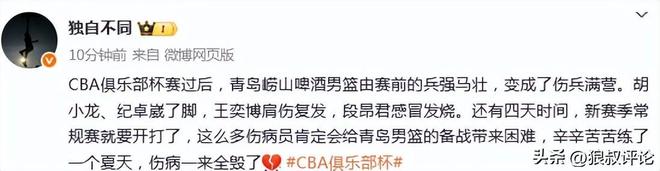 北京时间12月8日,CBA杯赛继续开打,山东男篮100-93击败青岛男篮,锁定最后一个八强席位。本场比赛,大量的高尺度对抗,甚至出现一些对球员去侵犯的动作引发外界的热议,两队合计交出了43次犯规,其中山东24次,青岛17次,山东25次罚球,青岛29次罚球。 王奕博,纪卓的受伤更是让本场比赛热议程度转移到裁判身上。他们的控场能力,以及是否有必要对允许一些持续加大的动作达到伤人的地步? 媒体人“球圈赵探长”发文点评:齐鲁德比确实激烈,但裁判是不是该有一些作为?确实是两边一致的纵容大动作,但结果就是有球员会受伤。 媒体人“三土带刺”发文点评:有球员在场上跟裁判说:你们能不能提高点水平? 媒体人“独自不同”发文点评:“CBA俱乐部杯赛过后,青岛崂山啤酒男篮由赛前的兵强马壮,变成了伤兵满营。胡小龙、纪卓崴了脚,王奕博肩伤复发,段昂君感冒发烧。还有四天时间,新赛季常规赛就要开打了,这么多伤病员肯定会给青岛男篮的备战带来困难,辛辛苦苦练了一个夏天,伤病一来全毁了”。 有球迷点评说道:“本来想着是场激烈对决,怎知被裁判整无语了,这赛季的哨子都把我整糊涂了”。山东德比大战,完全不逊色季后赛级别的对抗尺度,但球员受伤,裁判无动于衷就让人很无奈了。