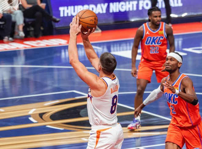 本场比赛可以看清四个事实。首先,缺少布克和杰伦格林,太阳和雷霆可能相差2-3个等级,每个位置都对不上,包括出战高阶数据颇佳的马威,在霍姆格伦面前如同霜打的茄子。太阳内线攻不进去,外线也没手感,一直被雷霆追着打反击,场面太狼狈了。其次,雷霆太强了!雷霆当下具备单节就拉开20分的能力,大前提是面对联盟几乎所有球队!雷霆本赛季防守效率联盟独一档的存在,场均控制失误+场均抢断数都是最高一档,单就抓失误反击得分能力,场均就有25分入账。对手想控制失误+限制雷霆反击,都很难不到。