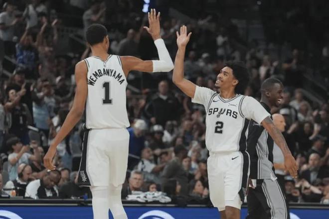 防守端马刺队有文班亚马这个BUG级的联盟最佳防守球员,所以球队防守体系非常容易建立,目前球队防守效率113.1排名全联盟第6,队内所有球员在这个体系中都有防守加成,简单点说,即便第一层外线防守被突破,对手进入内线面对的也是恐怖的文班亚马封盖干扰,马刺队外线防守球员只需紧跟进攻人,不给投篮空间,甚至可以故意把他驱赶到文班亚马的防守覆盖区遭受打击,防守压力相比其他球队减少一个级别.
